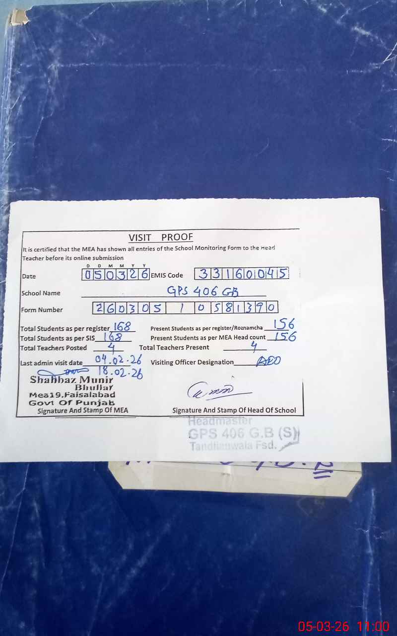 | EMIS Code: 33160045 | Name of School: GPS CHAK 406 GB SOUTH TANDLIANWALA | |||