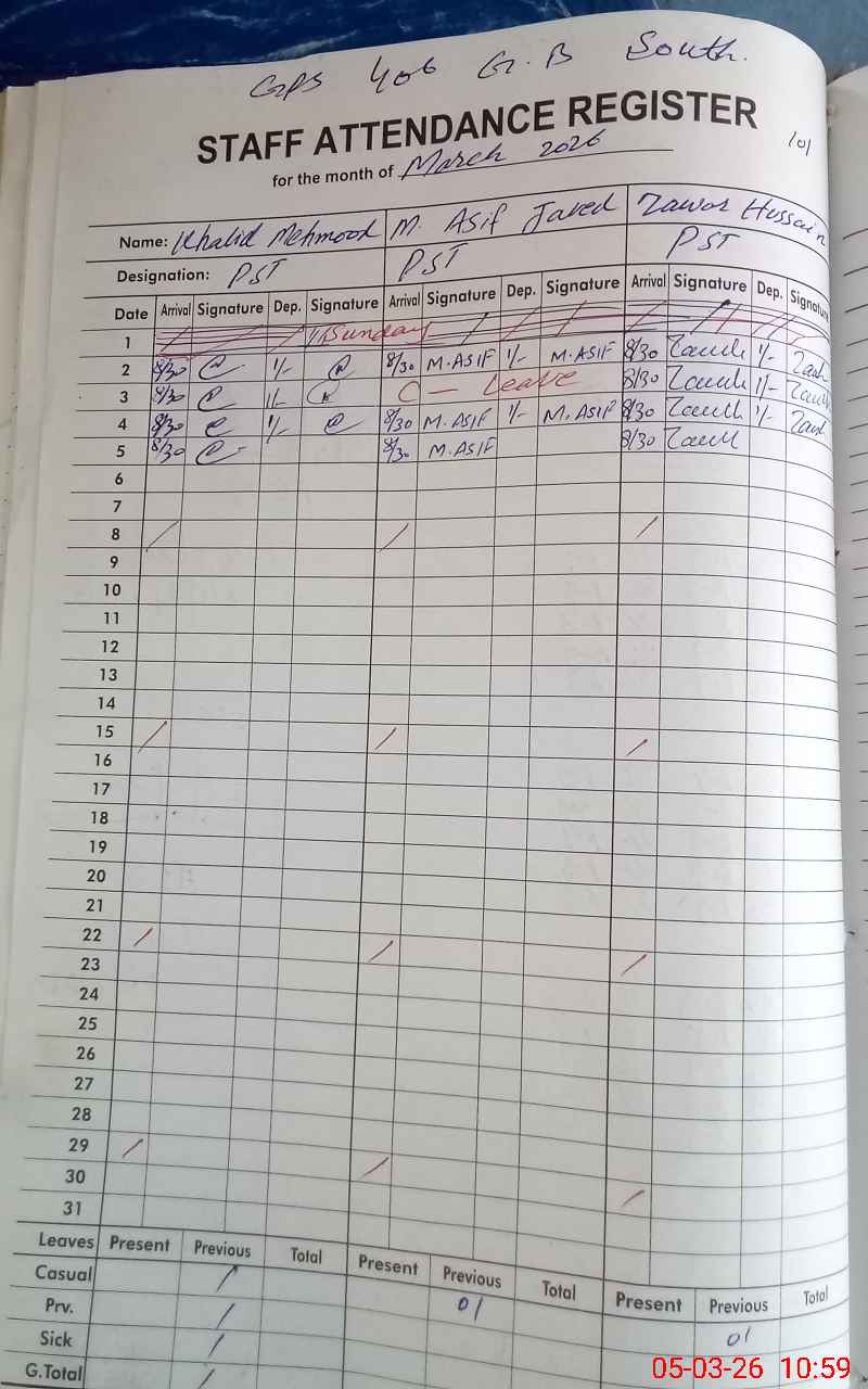 | CNIC | Full Name | Designation | R/C | Absence During Last Calender Month |