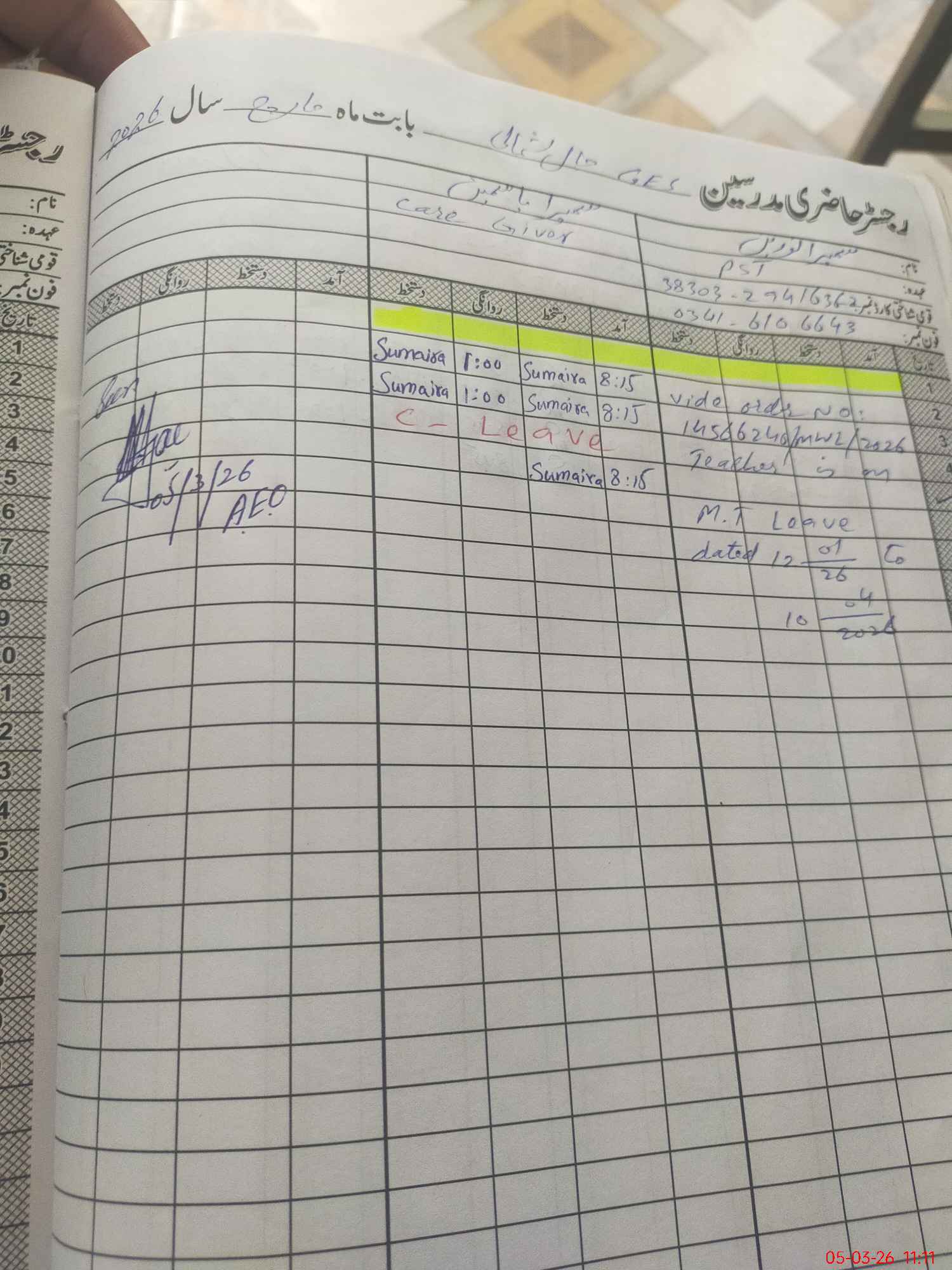 | Name of AEO: | AEO Contact No.: | MEA Phone#: 03**** | ||