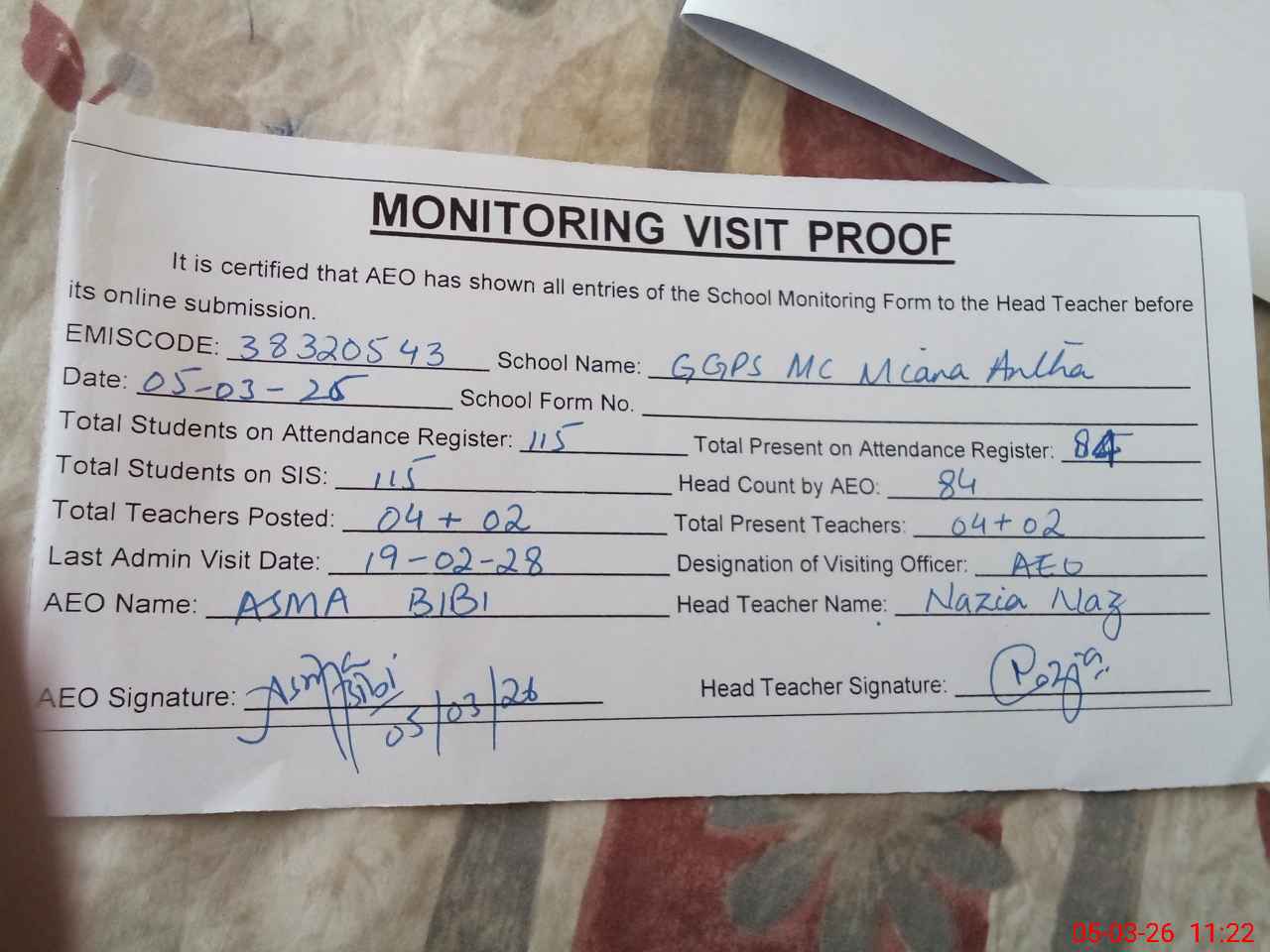 | EMIS Code: 38320543 | Name of School: GGPS MC MOHALLAH MIANA ANTHA | |||