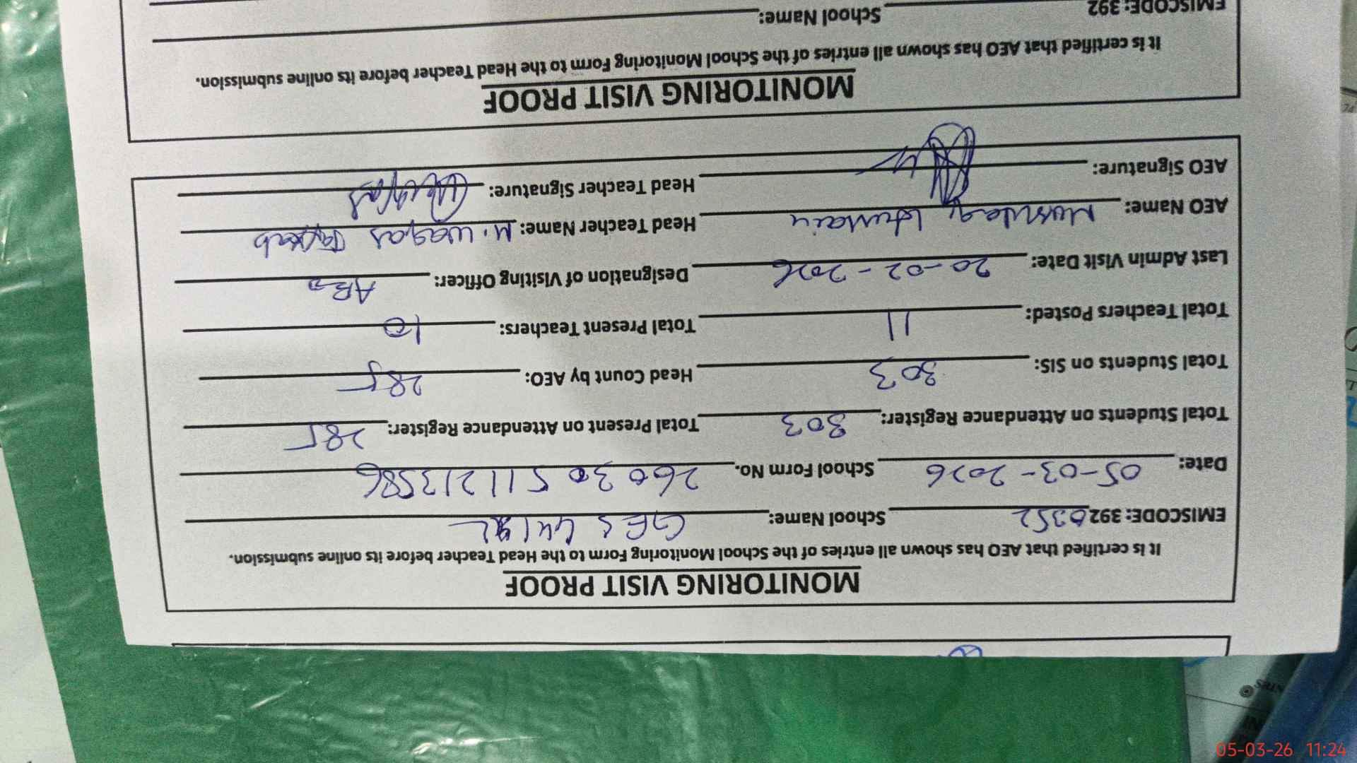 | Certified that this School was Inspected by the Undersigned MEA/DMO Today and the Information Stated Above is as Per Record. | |||||