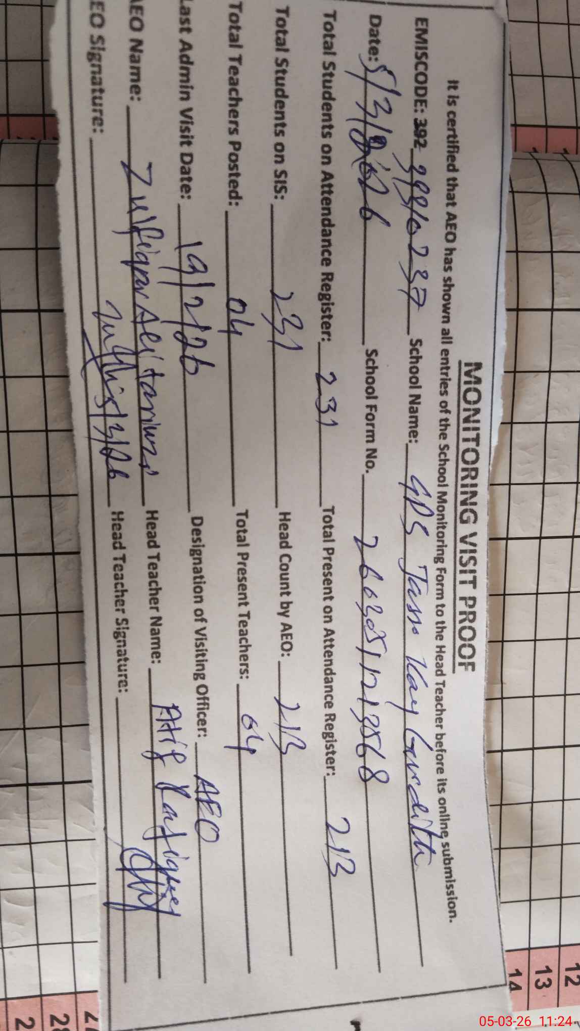 | Monitoring Date: 05-03-2026 | Start Time: 05-03-2026 11:06 AM | End Time: 05-03-2026 11:24 AM | Name of MEA: Zu**** Al**** Ta**** | |