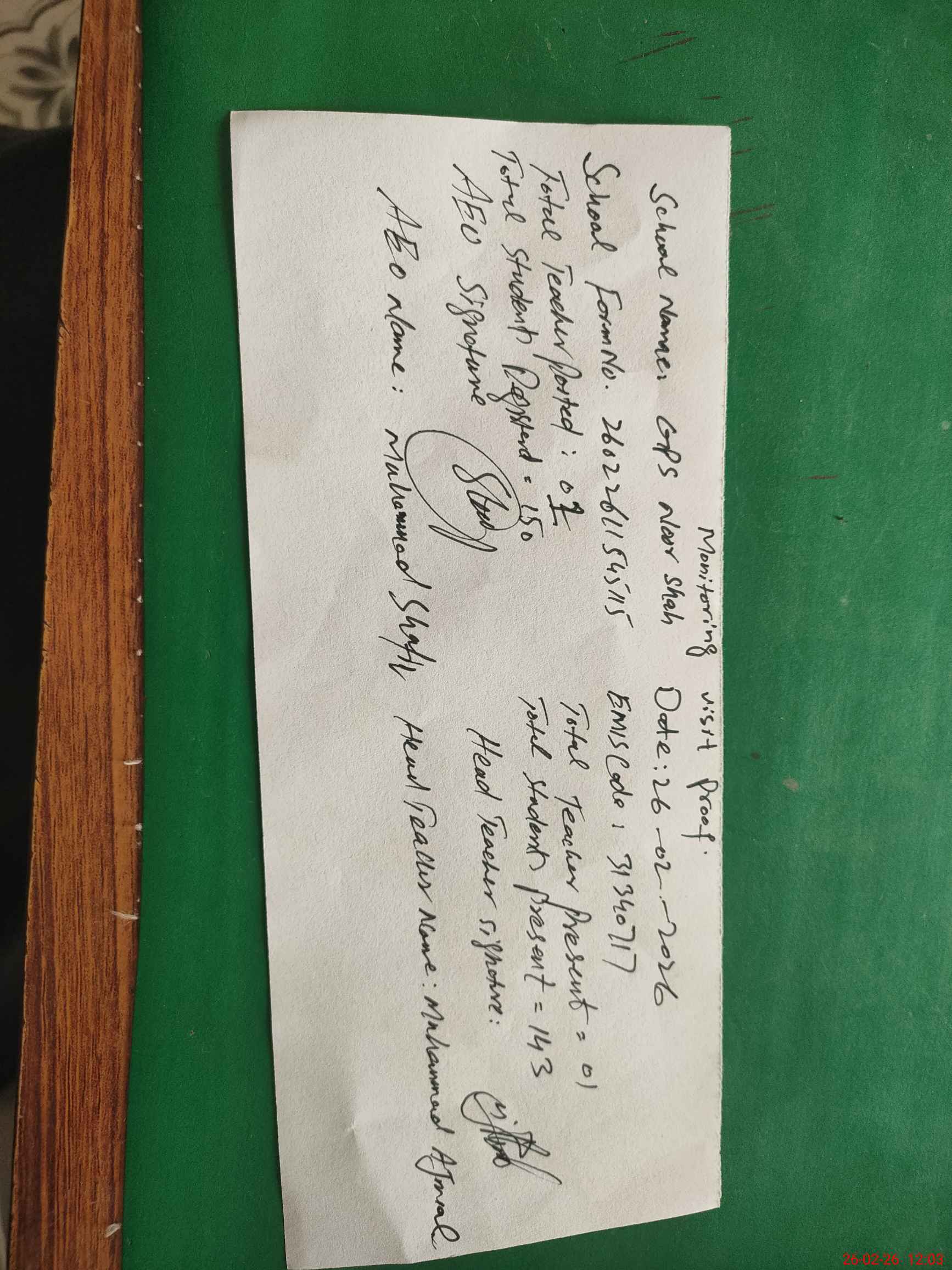 | Monitoring Date: 26-02-2026 | Start Time: 26-02-2026 11:35 AM | End Time: 26-02-2026 12:03 PM | Name of MEA: Mu**** Sh**** | |