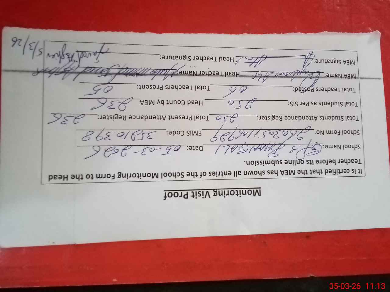 | Attendance Register | Head Teacher | MEA with School | Visit Proof |