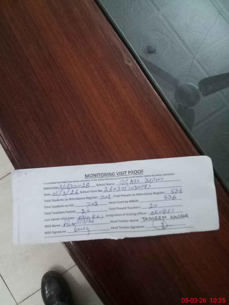 | Attendance Register | Head Teacher | MEA with School | Visit Proof |