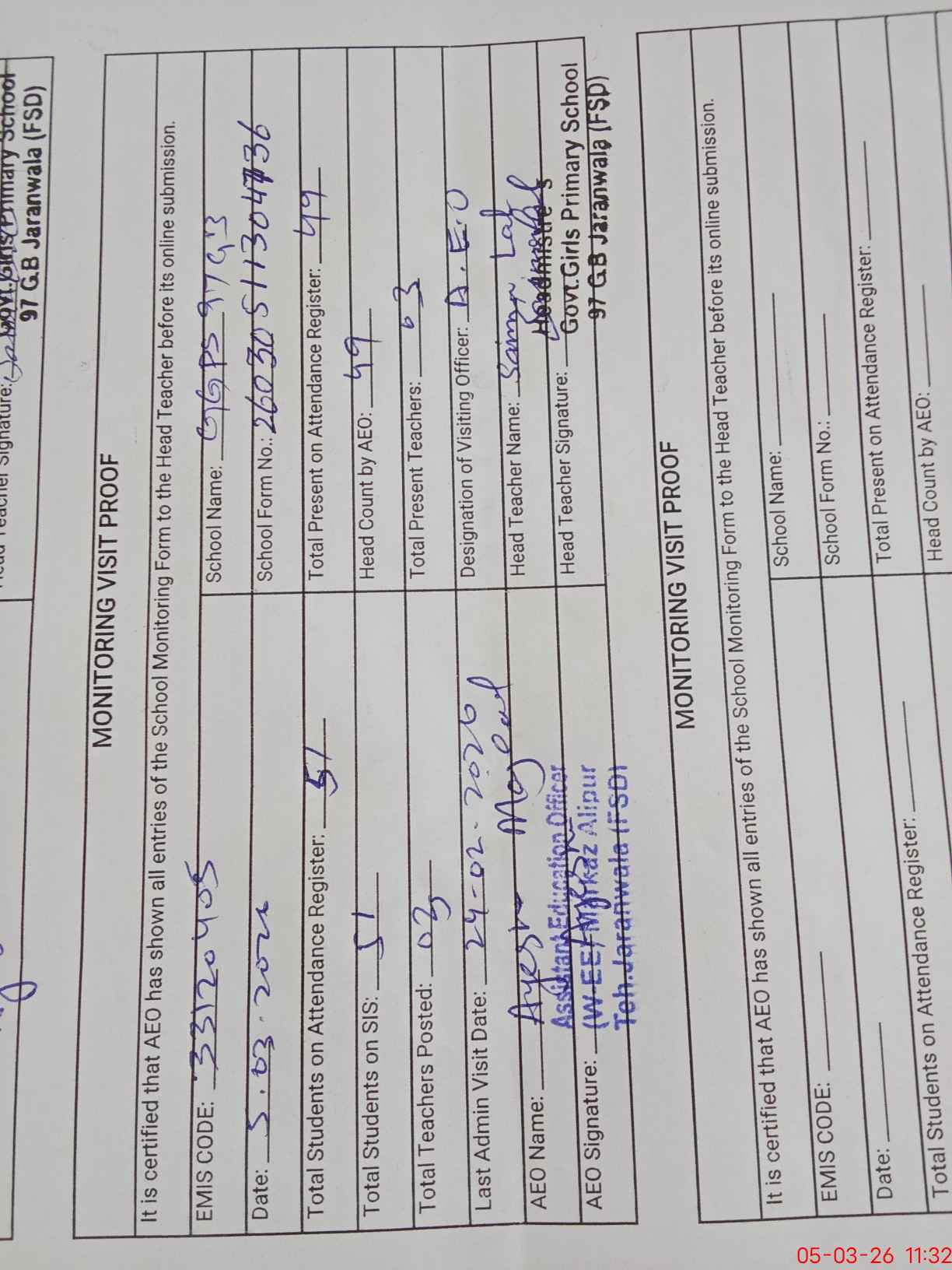 | EMIS Code: 33120405 | Name of School: GGPS CHAK 97 GB JARANWALA | |||