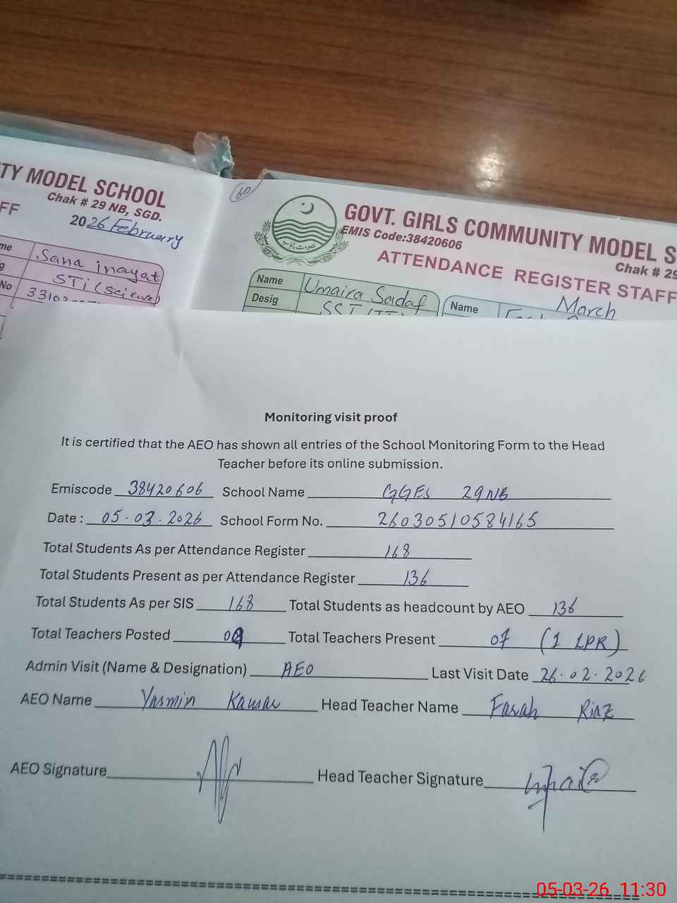| Attendance Register | Head Teacher | MEA with School | Visit Proof |