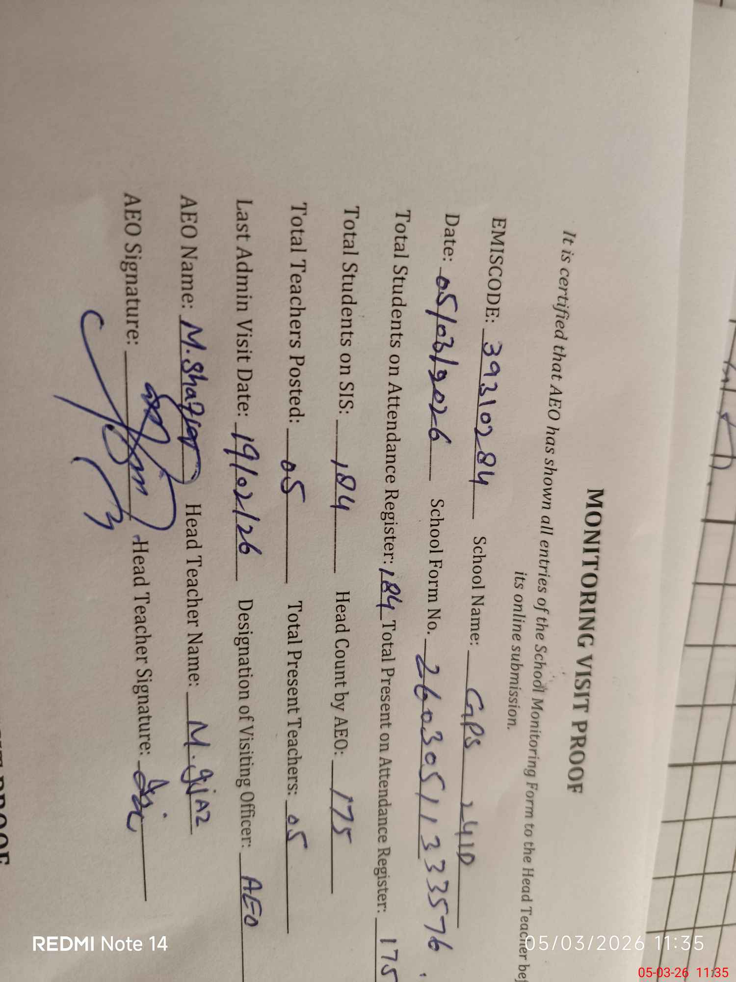 | EMIS Code: 39310284 | Name of School: GPS CHAK 24-D | |||