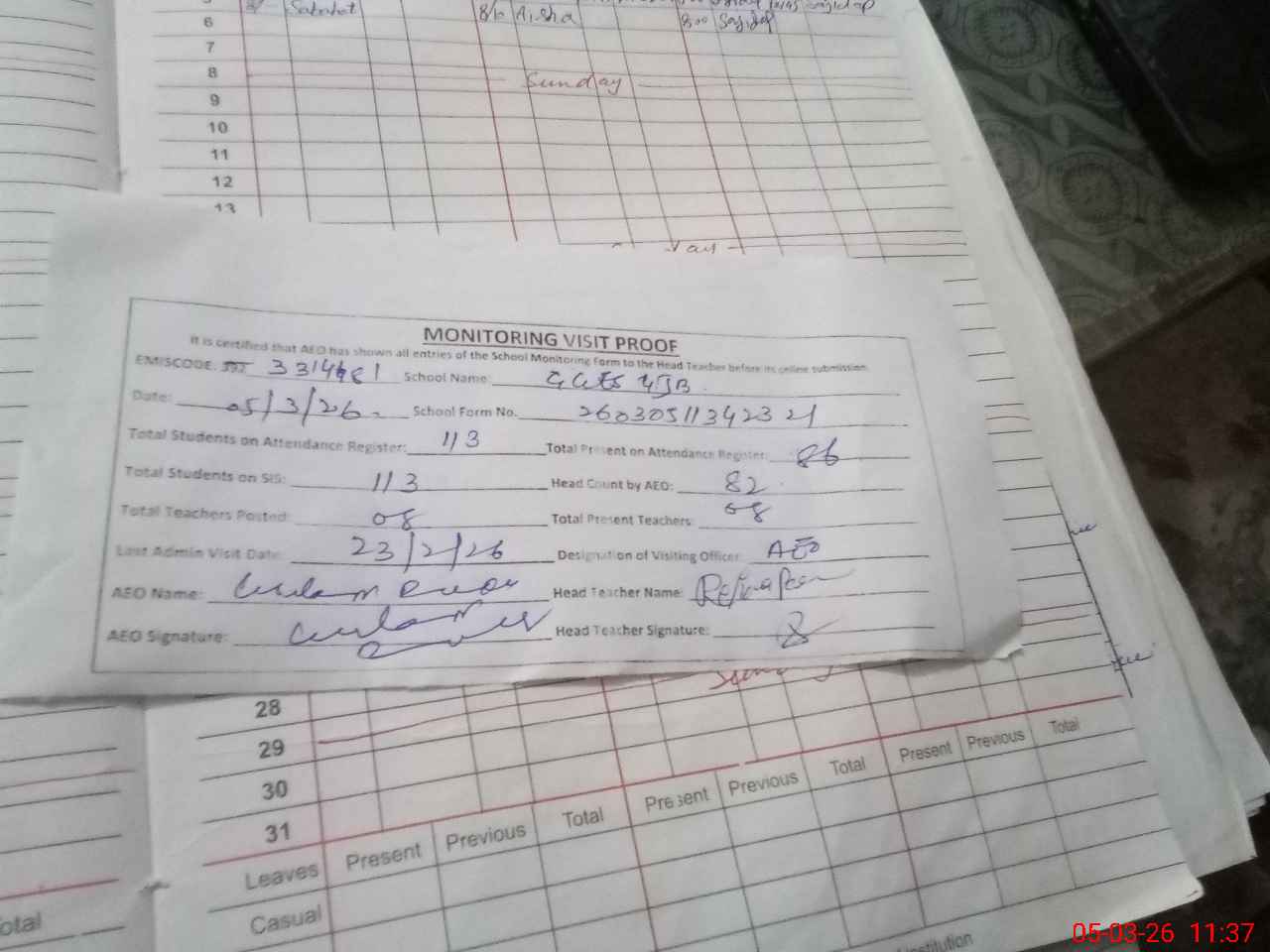 | Attendance Register | Head Teacher | MEA with School | Visit Proof |