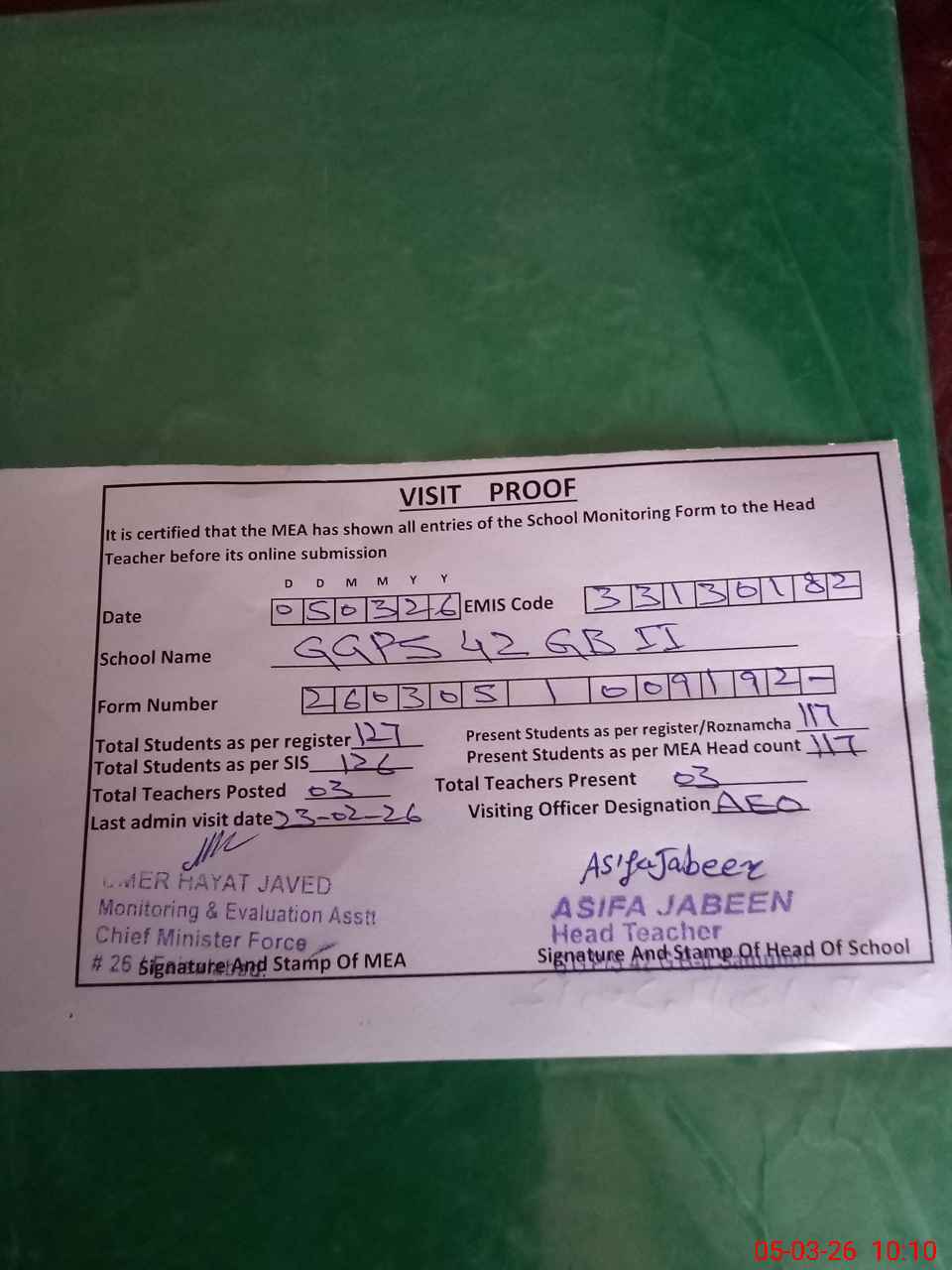 | EMIS Code: 33130182 | Name of School: GGPS CHAK 42 GB II SAMUNDRI | |||
