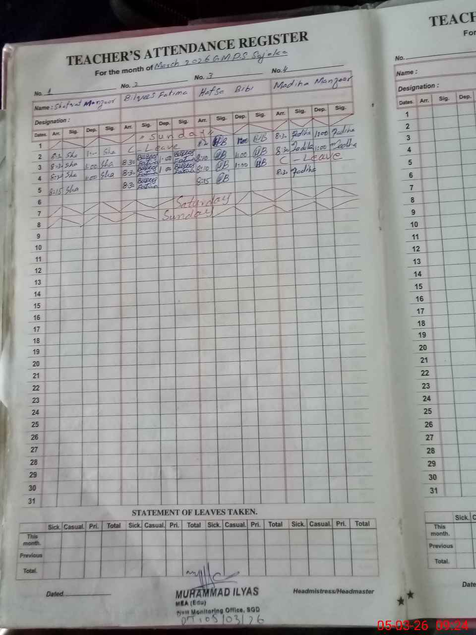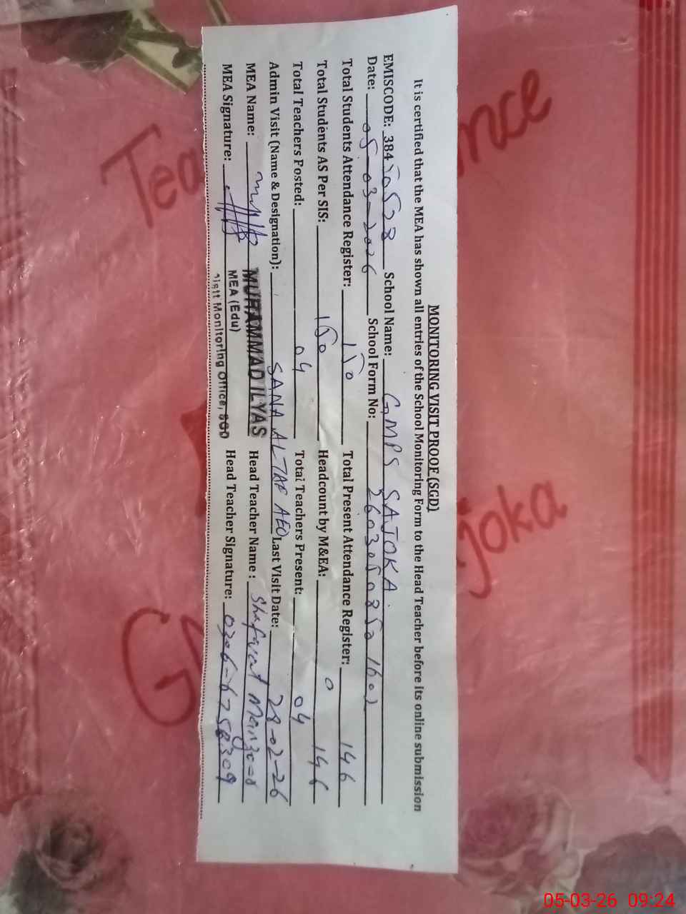 | Attendance Register | Head Teacher | MEA with School | Visit Proof |