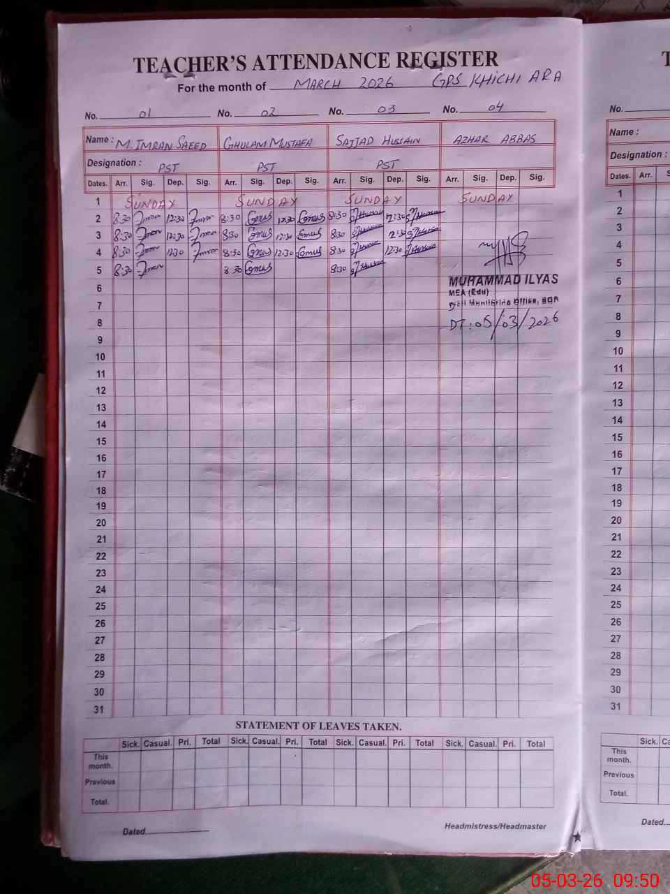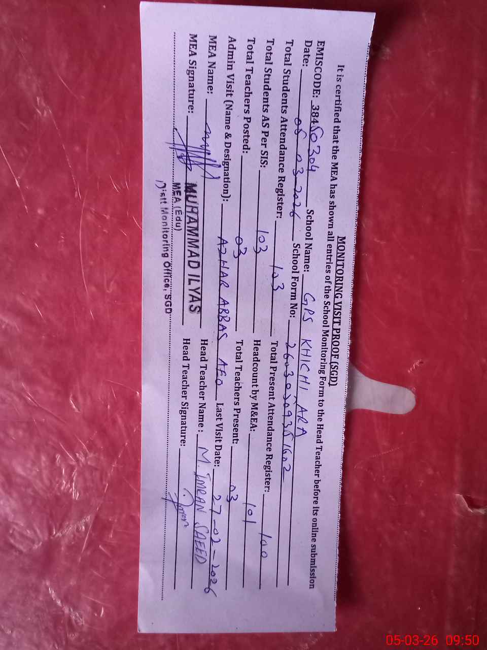 | Attendance Register | Head Teacher | MEA with School | Visit Proof |