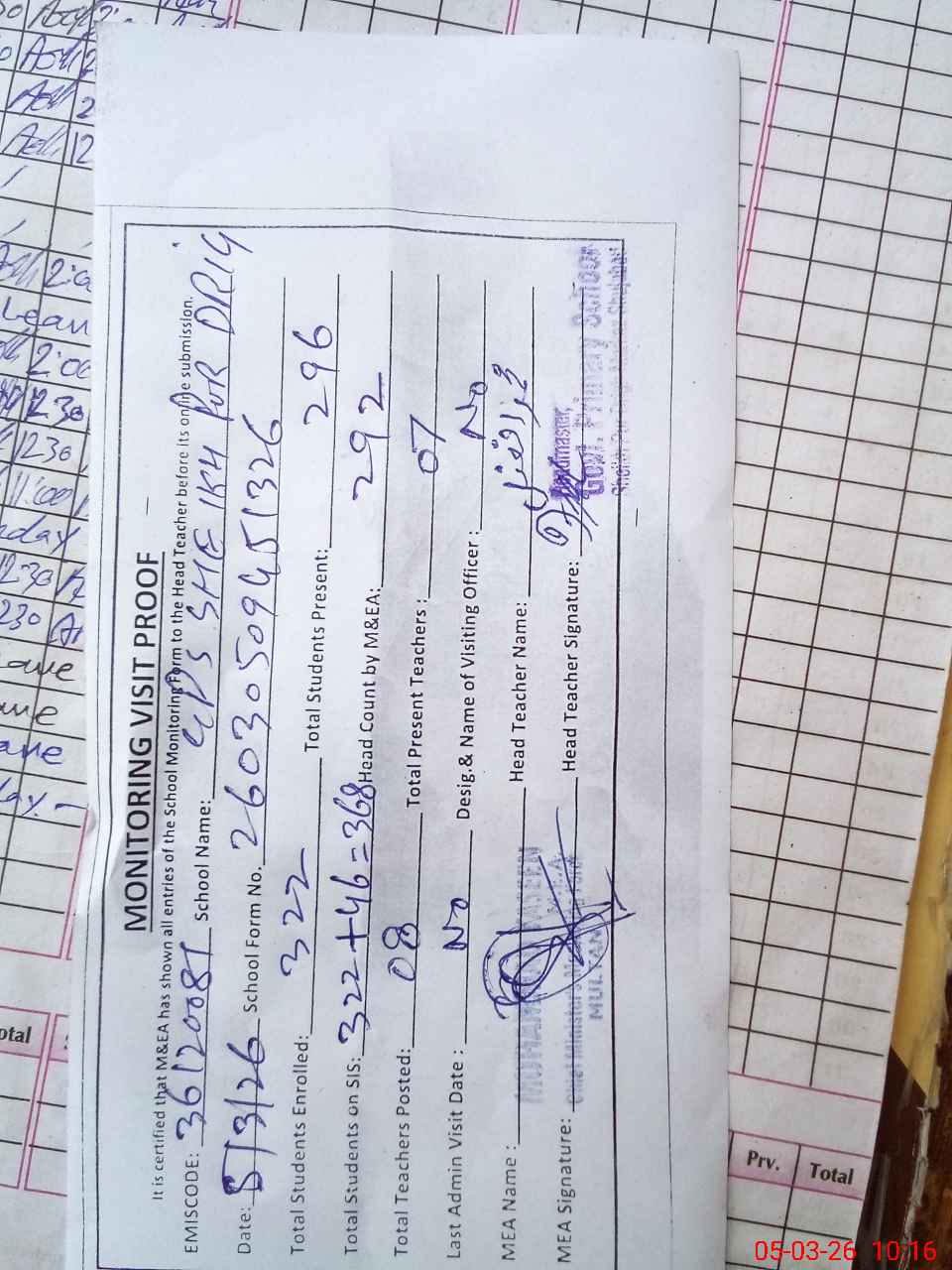 | Attendance Register | Head Teacher | MEA with School | Visit Proof |