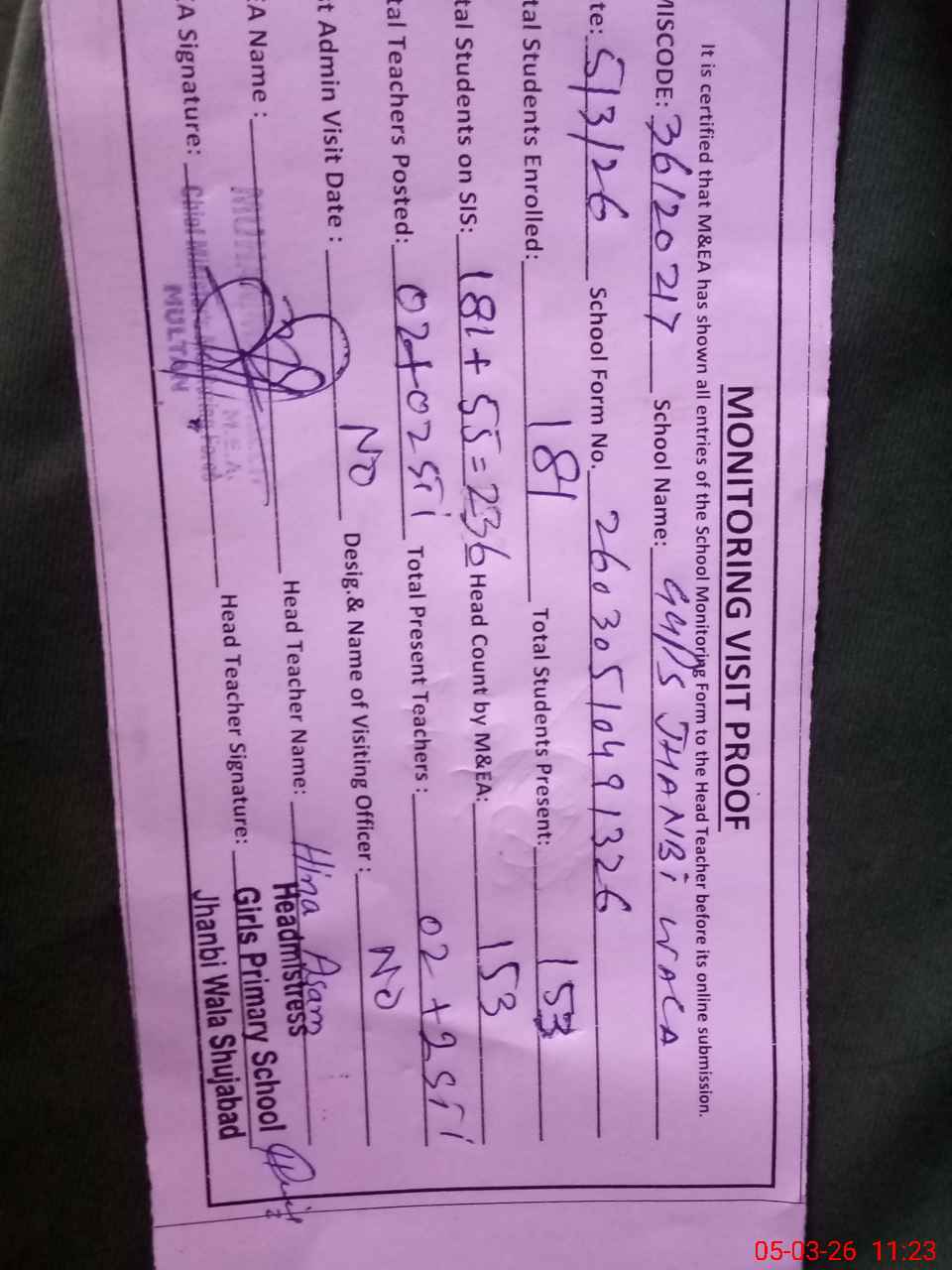 | EMIS Code: 36120217 | Name of School: GGPS JHANBI WALA SHUJABAD DISTT. MULTAN | |||