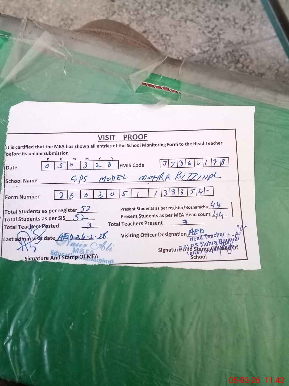 | Attendance Register | Head Teacher | MEA with School | Visit Proof |