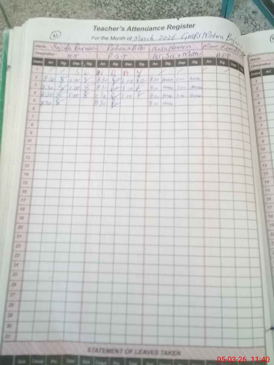 | Monitoring Date: 05-03-2026 | Start Time: 05-03-2026 11:30 AM | End Time: 05-03-2026 11:43 AM | Name of MEA: Na**** Al**** | |
