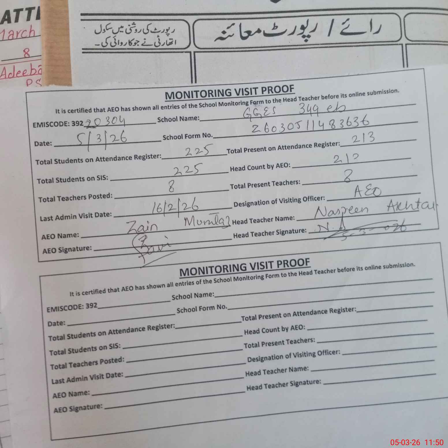 | Monitoring Date: 05-03-2026 | Start Time: 05-03-2026 11:31 AM | End Time: 05-03-2026 11:50 AM | Name of MEA: Za**** Mu**** | |