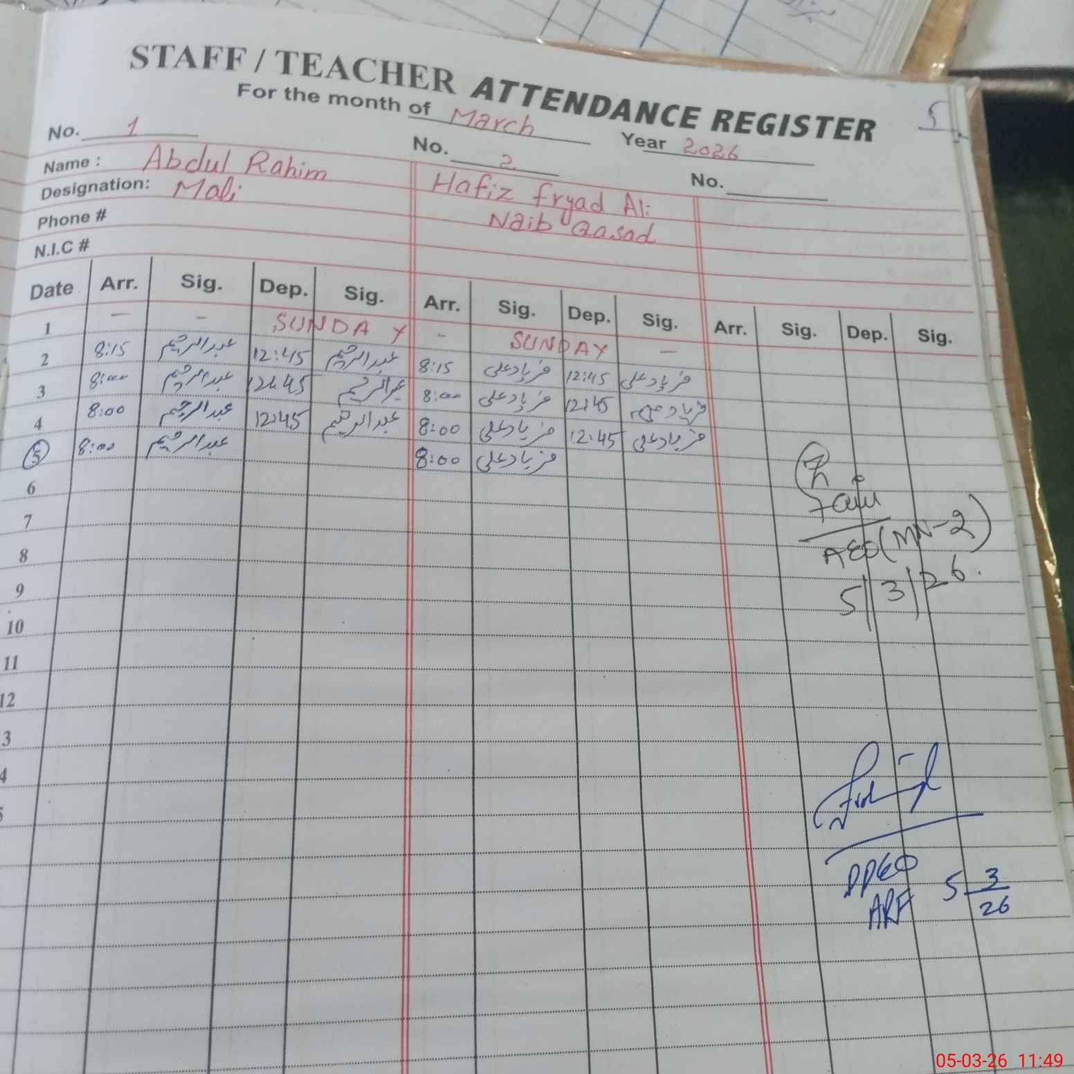 | Name: NA**** AK**** Designation: (School Headmaster's/Headmistress's) SST (GENERAL) Phone/Cell Number: 03**** |