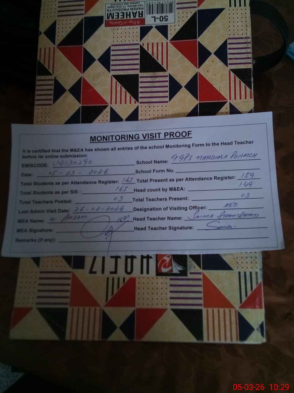 | Attendance Register | Head Teacher | MEA with School | Visit Proof |