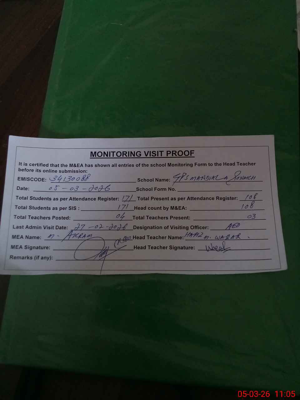 | Monitoring Date: 05-03-2026 | Start Time: 05-03-2026 10:35 AM | End Time: 05-03-2026 11:05 AM | Name of MEA: K-**** Ak**** | |