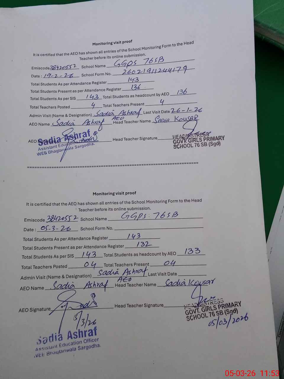 | Attendance Register | Head Teacher | MEA with School | Visit Proof |