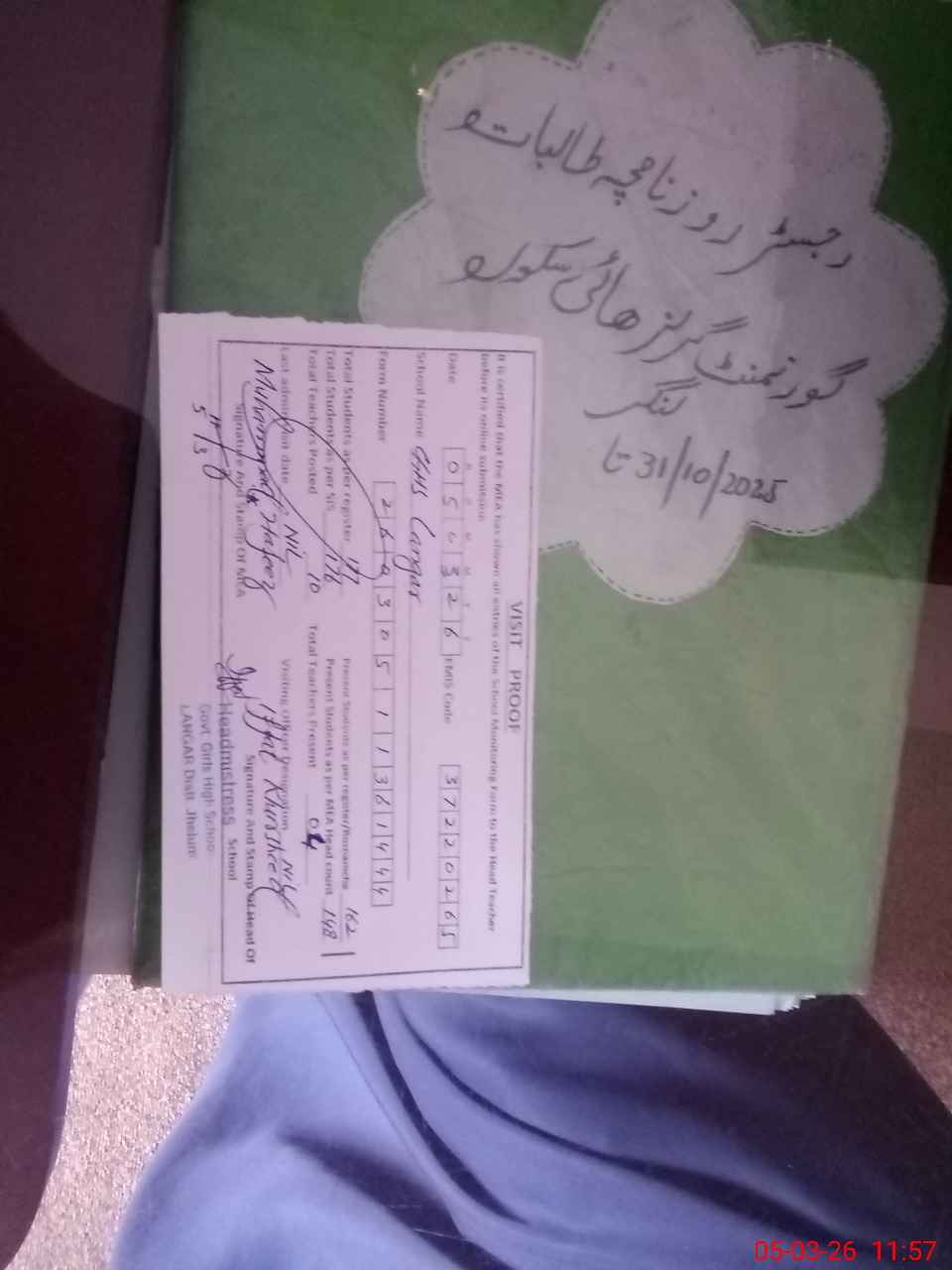 | Remarks (Use Separate Page if Required): Sir. *1* 3x classes are sitting in open air on mud ground picture are available. *2* Two, Four, One and Five class students attendance register not shown Teacher Nazia tell me these class teacher are not present in school. Their students attendance register are in their locker. *3* 9th class register not complete not attendance on register of 5- 3- 2026 picture are available. *4* NSB record not properly maintain 3 time I correct it on request from Headmistress. *5* Teacher Sidra not present in school but her fake present on register. *6* Teacher Tahira not present in school but her arrival on register. *Note* Not tell me from Headmistress about both teacher during visit I check him. Sir. Please check and instruct him | |||||