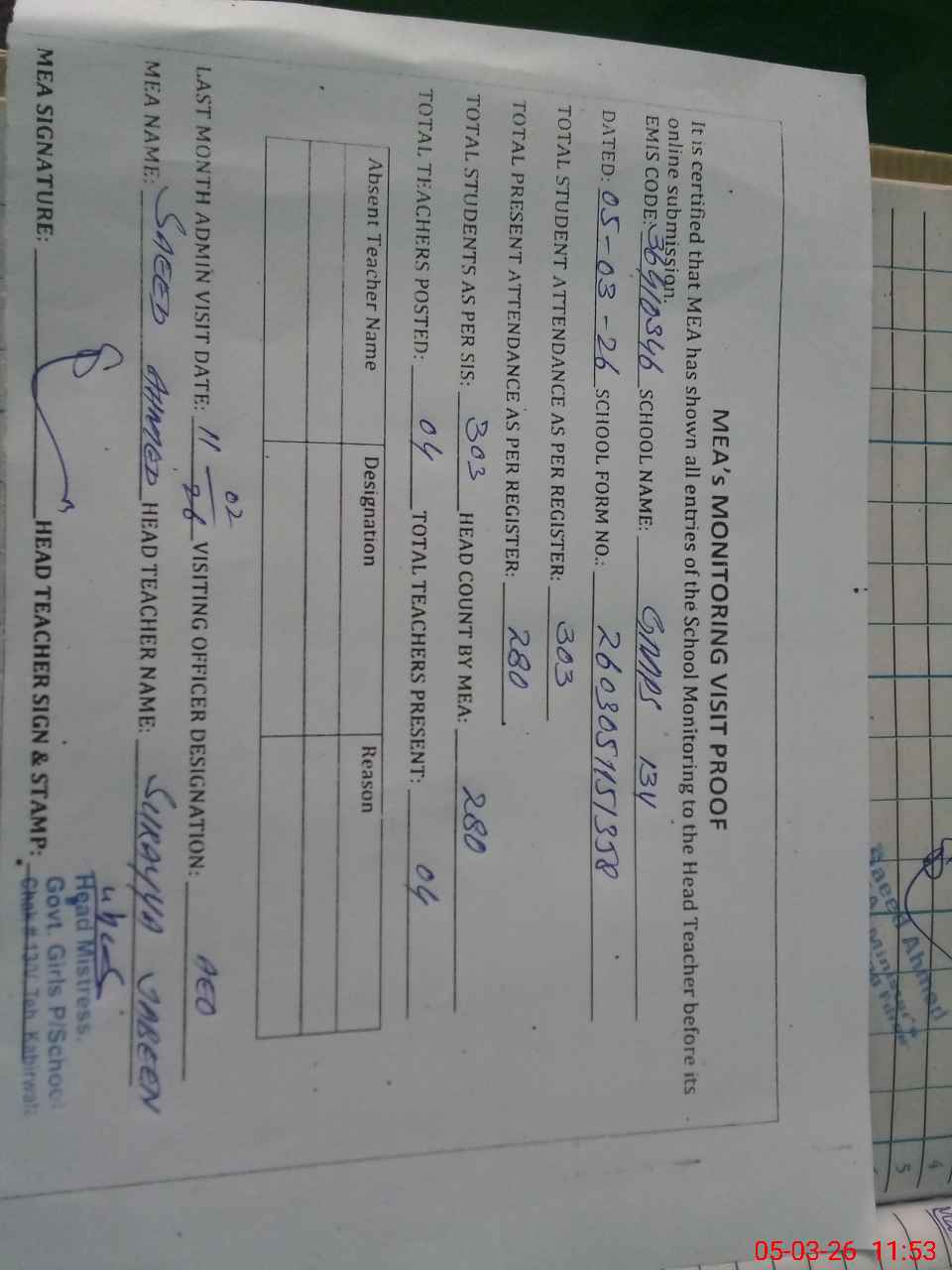 | Certified that this School was Inspected by the Undersigned MEA/DMO Today and the Information Stated Above is as Per Record. | |||||