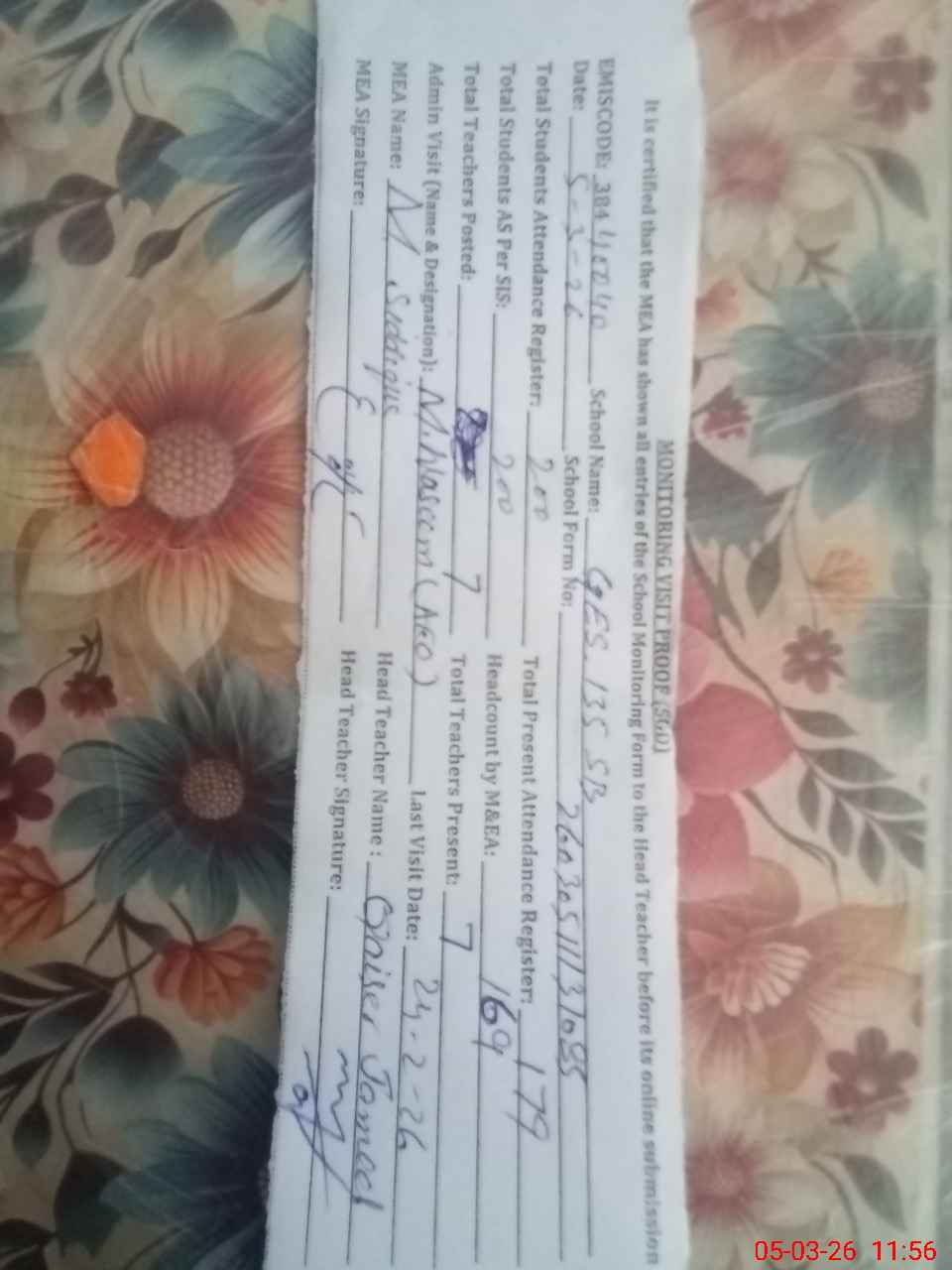 | Attendance Register | Head Teacher | MEA with School | Visit Proof |