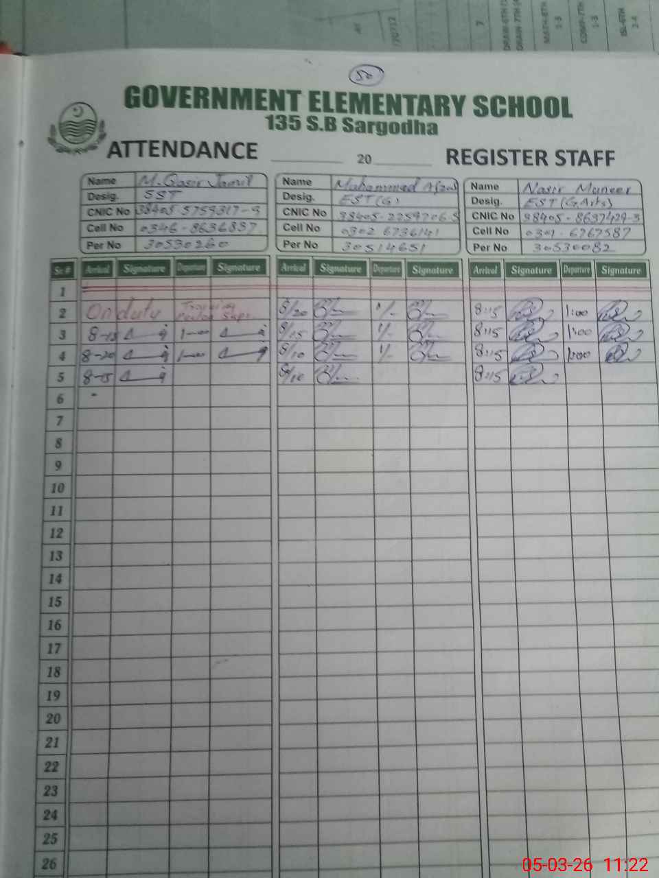 | CNIC | Full Name | Designation | R/C | Absence during last cal. month |