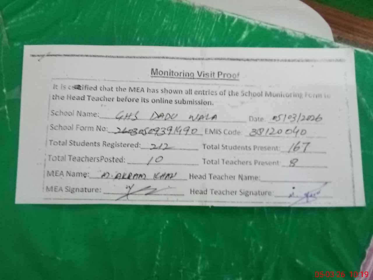 | EMIS Code: 38120040 | Name of School: GHS DADU WALA | |||