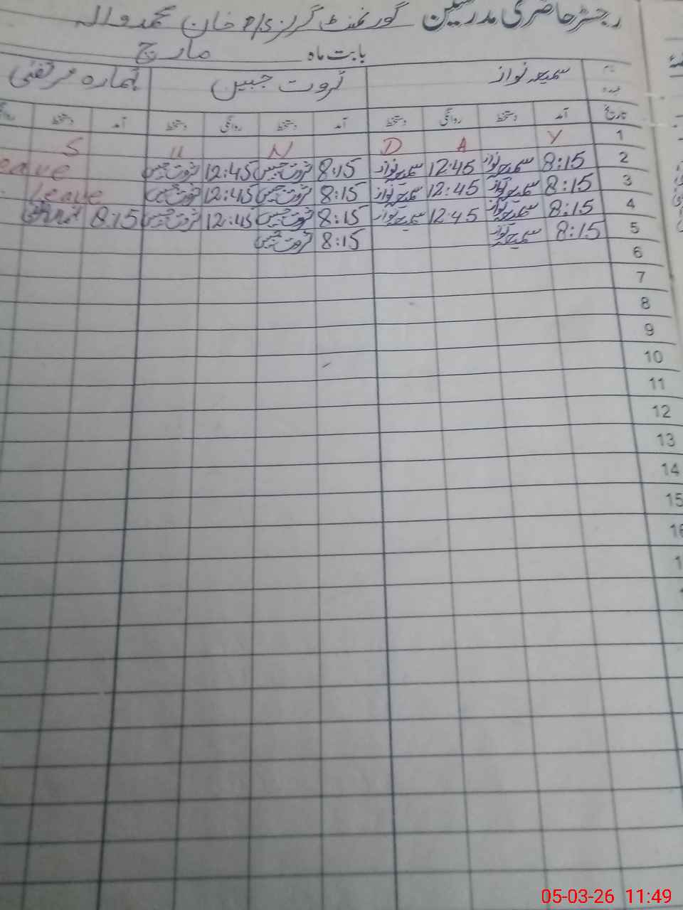 | CNIC | Full Name | Designation | R/C | Absence During Last Calender Month |