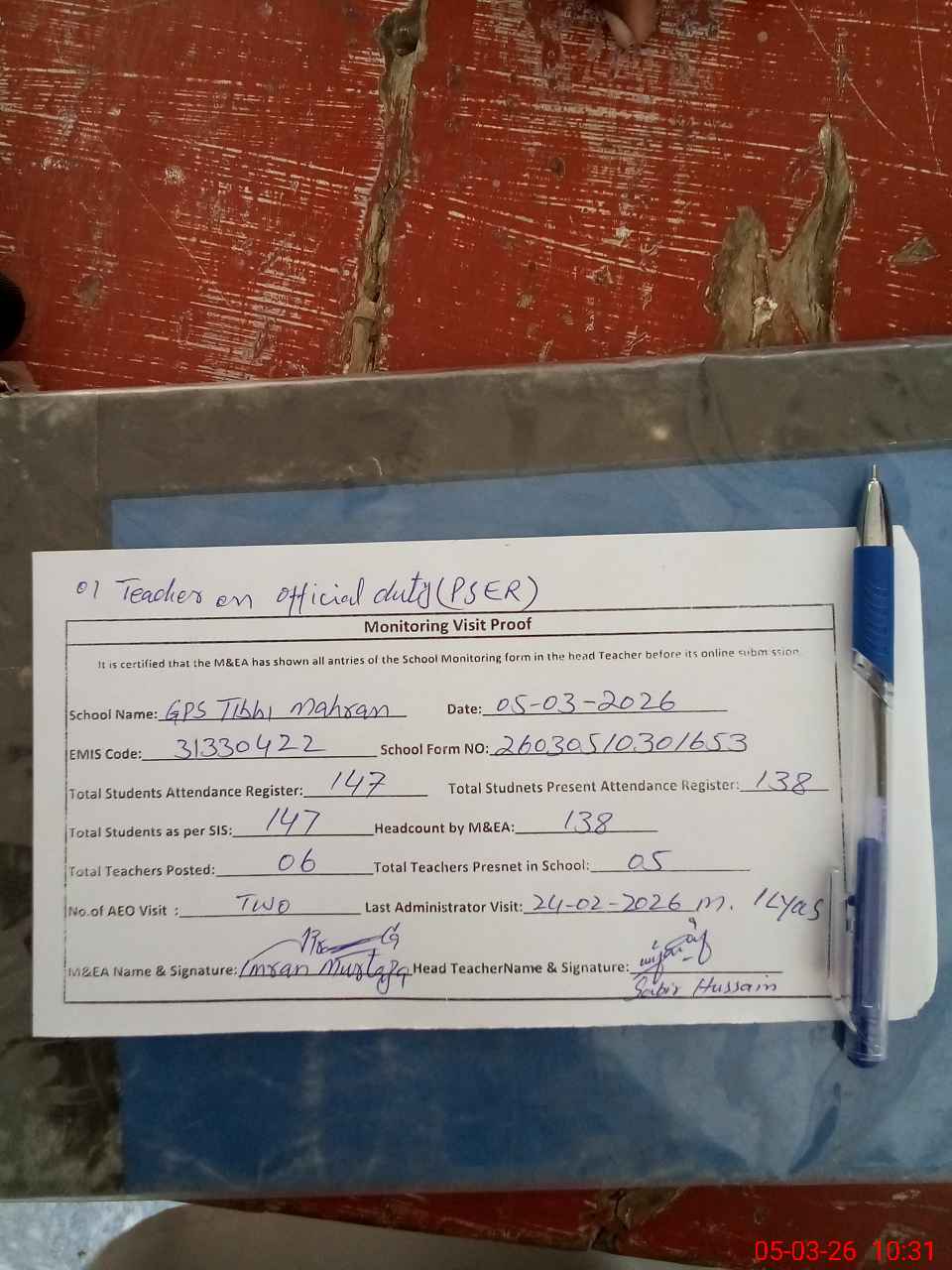 | Attendance Register | Head Teacher | MEA with School | Visit Proof |