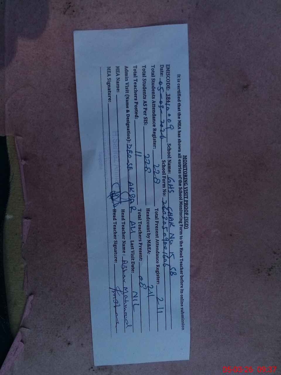 | Attendance Register | Head Teacher | MEA with School | Visit Proof |