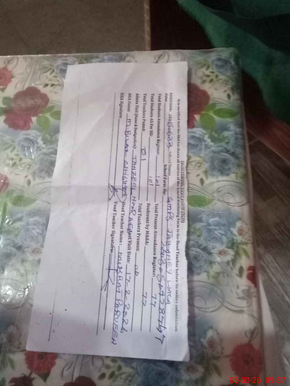 | Attendance Register | Head Teacher | MEA with School | Visit Proof |