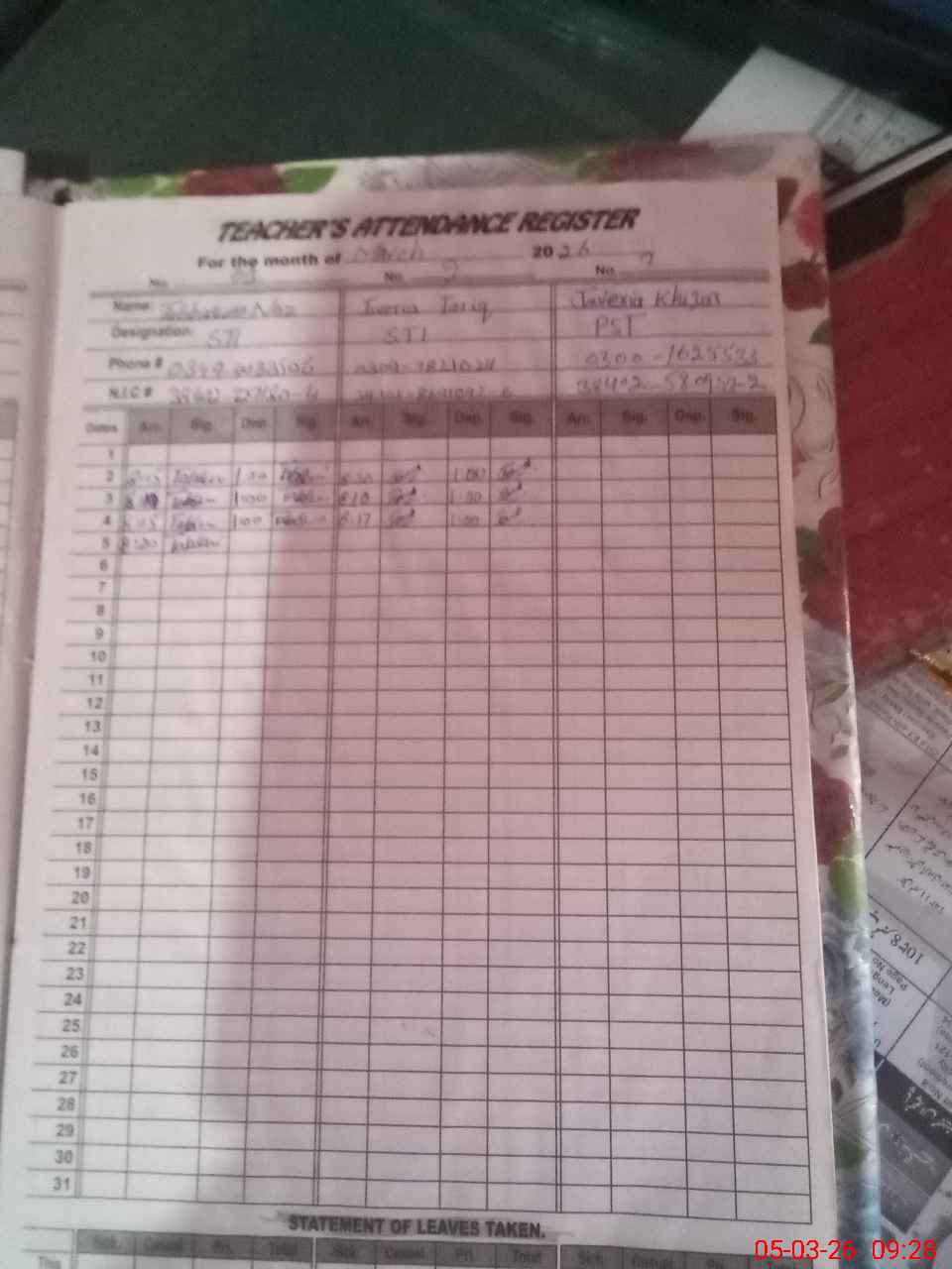| CNIC | Full Name | Designation | R/C | Absence During Last Calender Month |