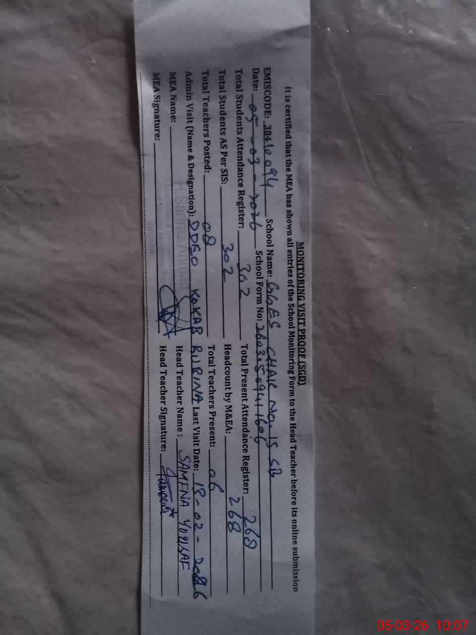 | Certified that this School was Inspected by the Undersigned MEA/DMO Today and the Information Stated Above is as Per Record. | |||||