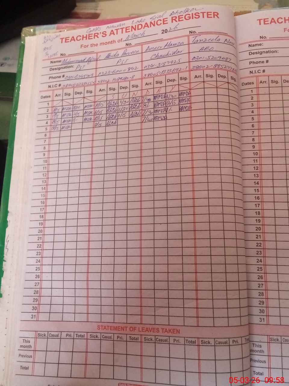 | CNIC | Full Name | Designation | R/C | Absence During Last Calender Month |