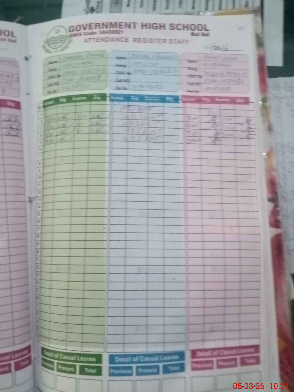 | CNIC | Full Name | Designation | R/C | Absence During Last Calender Month |