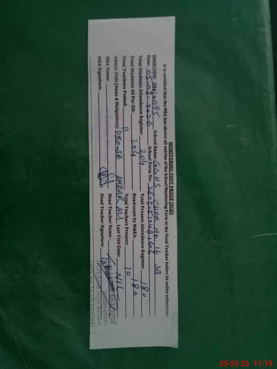 | Certified that this School was Inspected by the Undersigned MEA/DMO Today and the Information Stated Above is as Per Record. | |||||