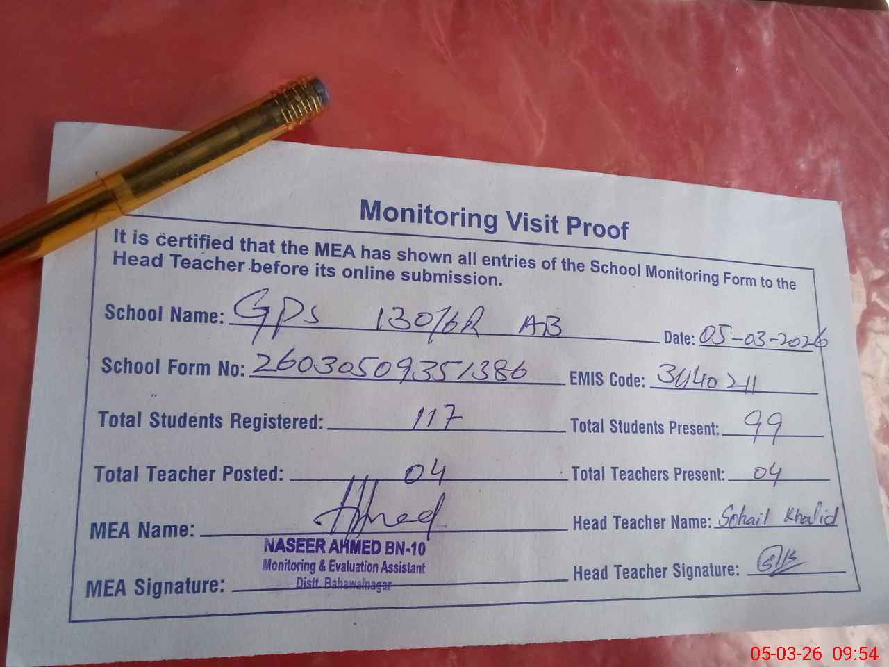 | EMIS Code: 31140211 | Name of School: GPS CHAK NO 130/6-R AB | |||