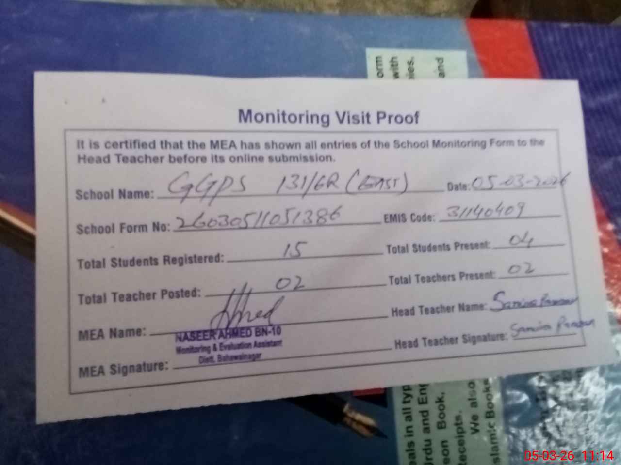 | Attendance Register | Head Teacher | MEA with School | Visit Proof |