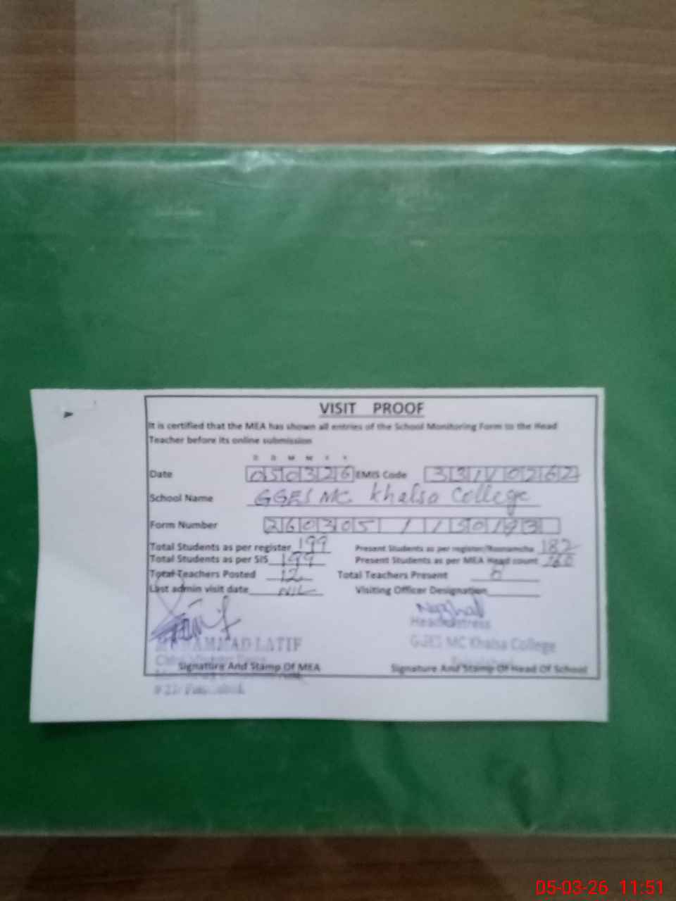 | Attendance Register | Head Teacher | MEA with School | Visit Proof |