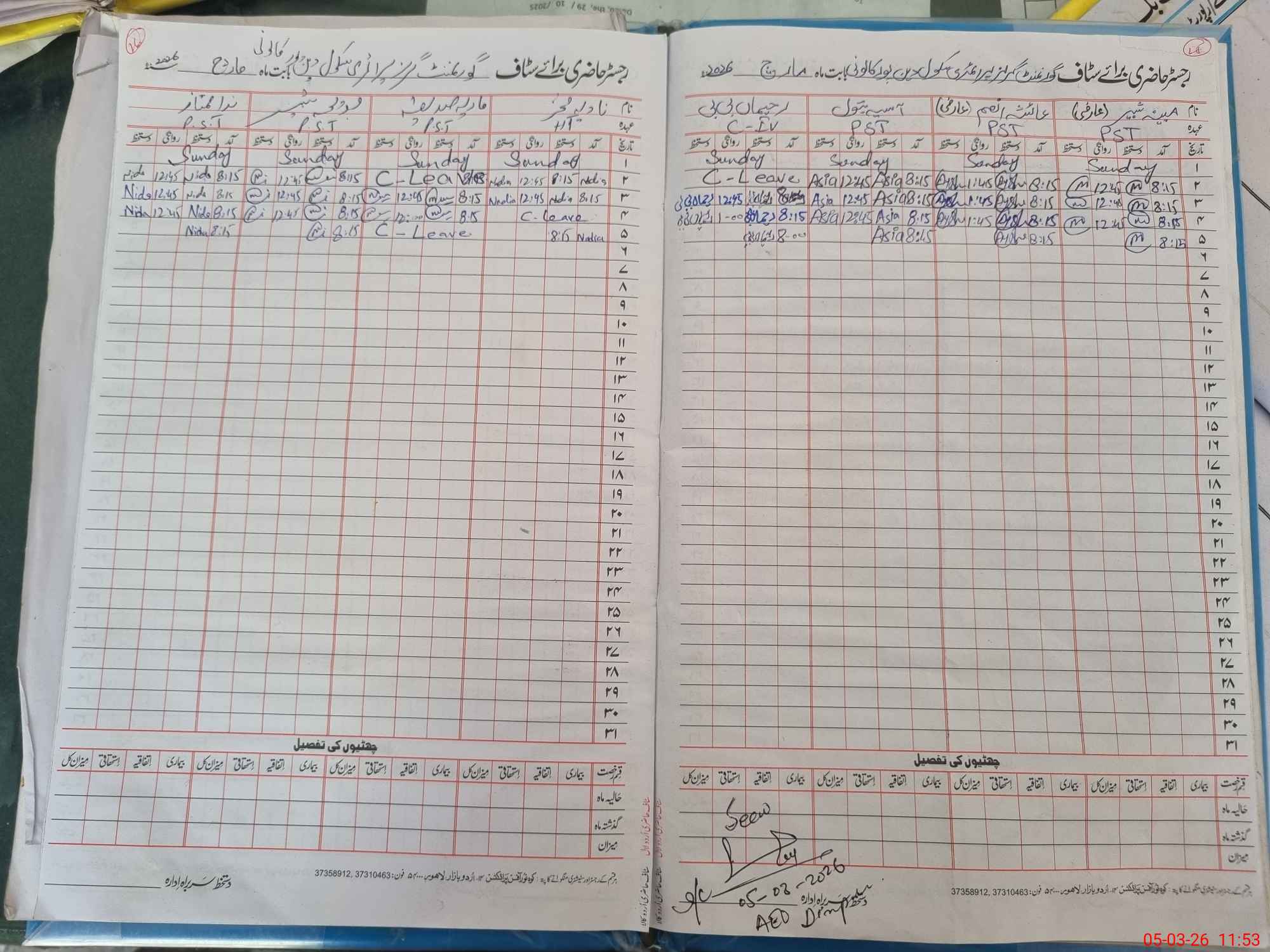 | CNIC | Full Name | Designation | R/C | Absence During Last Calender Month |