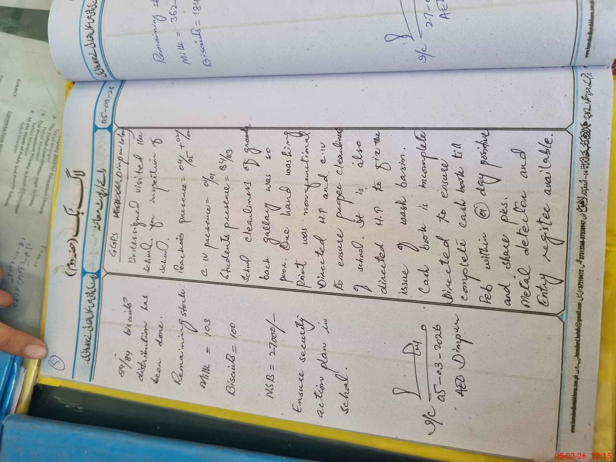 | Total no. of Classrooms: 3 No. of Classrooms Used for Teaching: 2 No. of Classrooms Storing Old Furniture, FTBs, etc: 0Comments if Any: 3 small rooms have been constructed by covering Veranda from NSB. One hand washing point was non functional. |