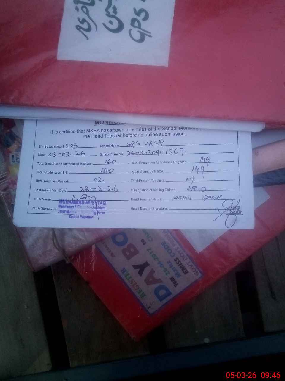 | Attendance Register | Head Teacher | MEA with School | Visit Proof |