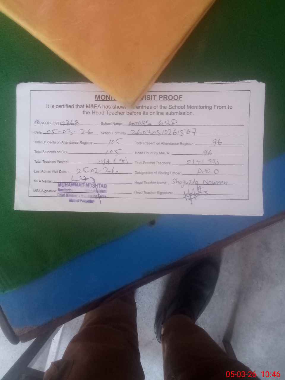 | Attendance Register | Head Teacher | MEA with School | Visit Proof |