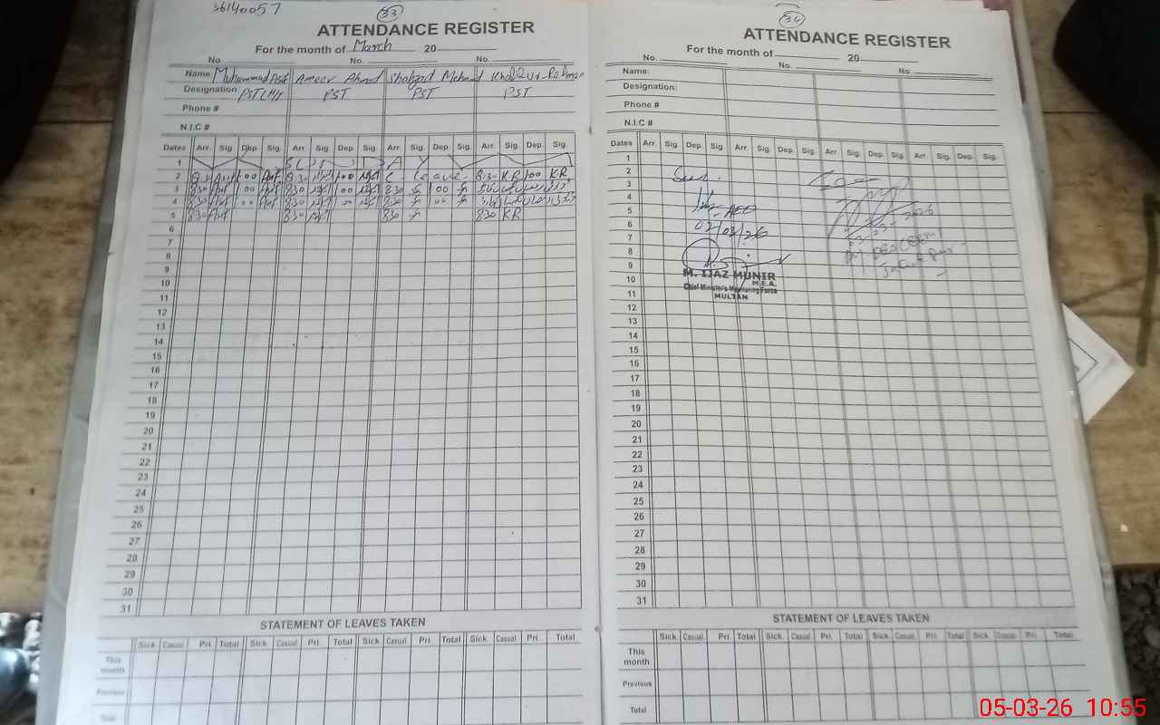 | CNIC | Full Name | Designation | R/C | Absence During Last Calender Month |