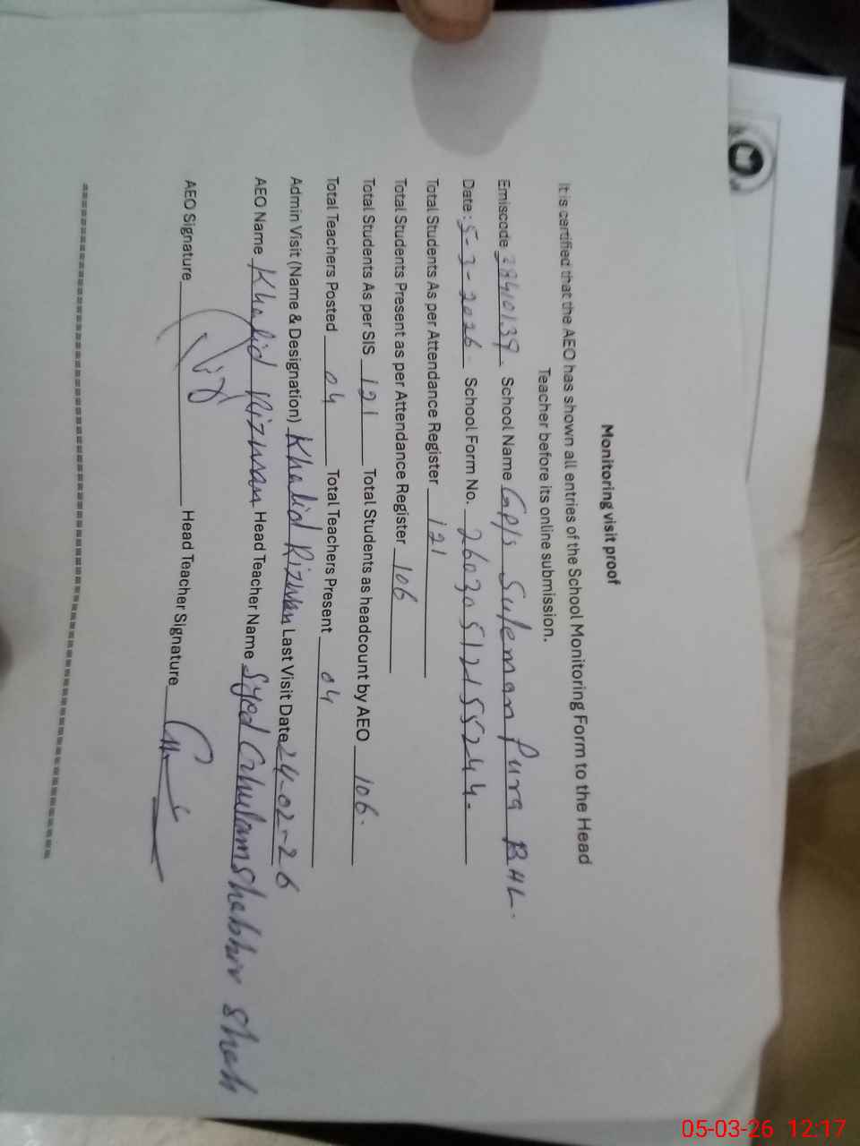 | EMIS Code: 38410139 | Name of School: GPS SULEMAN PURA | |||