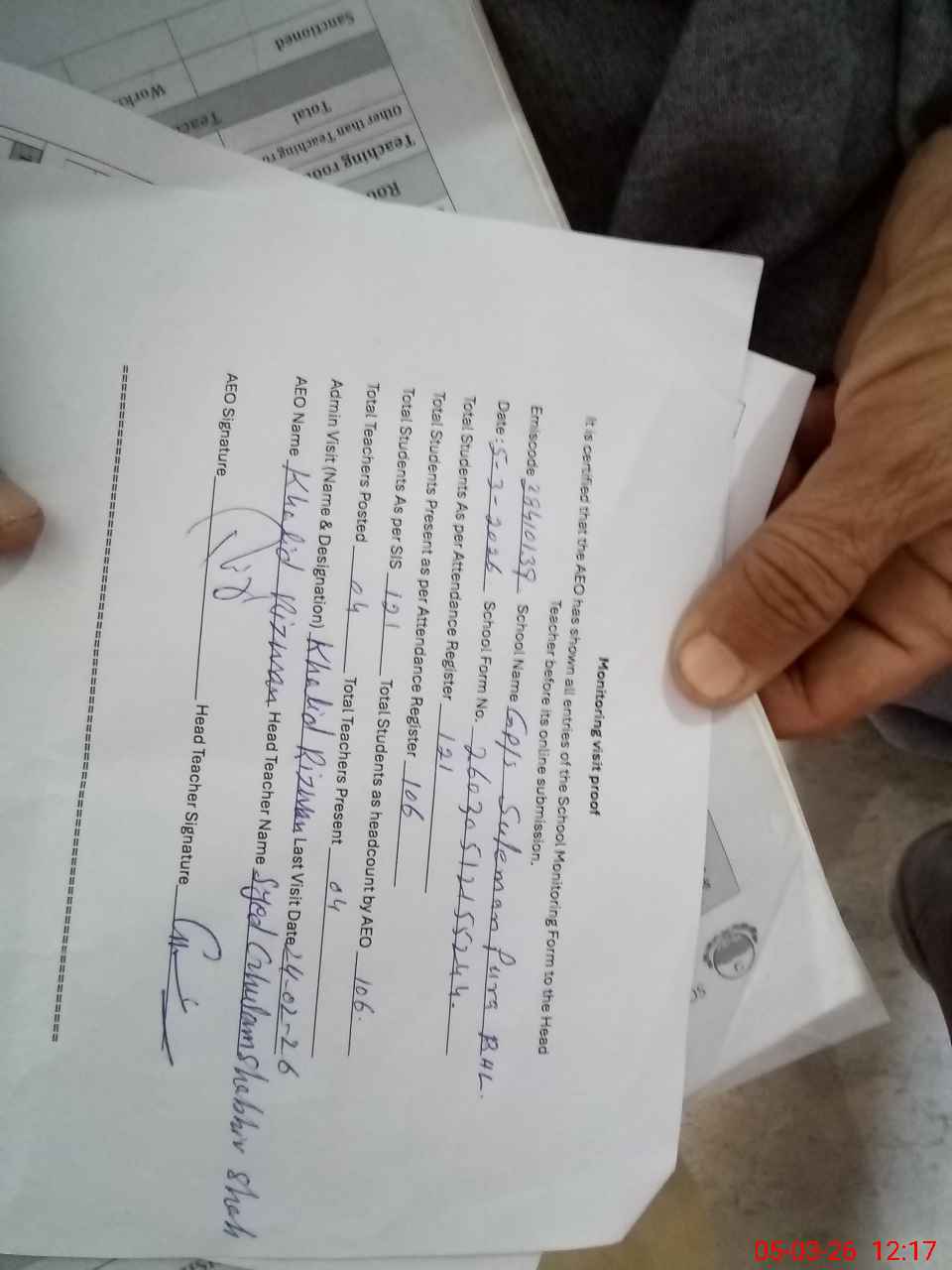 | Attendance Register | Head Teacher | MEA with School | Visit Proof |