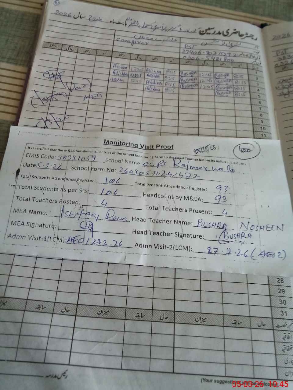 | Attendance Register | Head Teacher | MEA with School | Visit Proof |